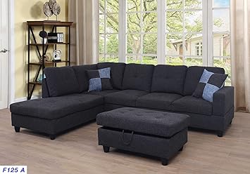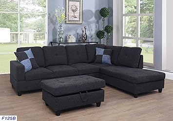 Beverly Fine Furniture F125a Left Facing Linen Russes Sectional Sofa Set With Ottoman Dark Grey