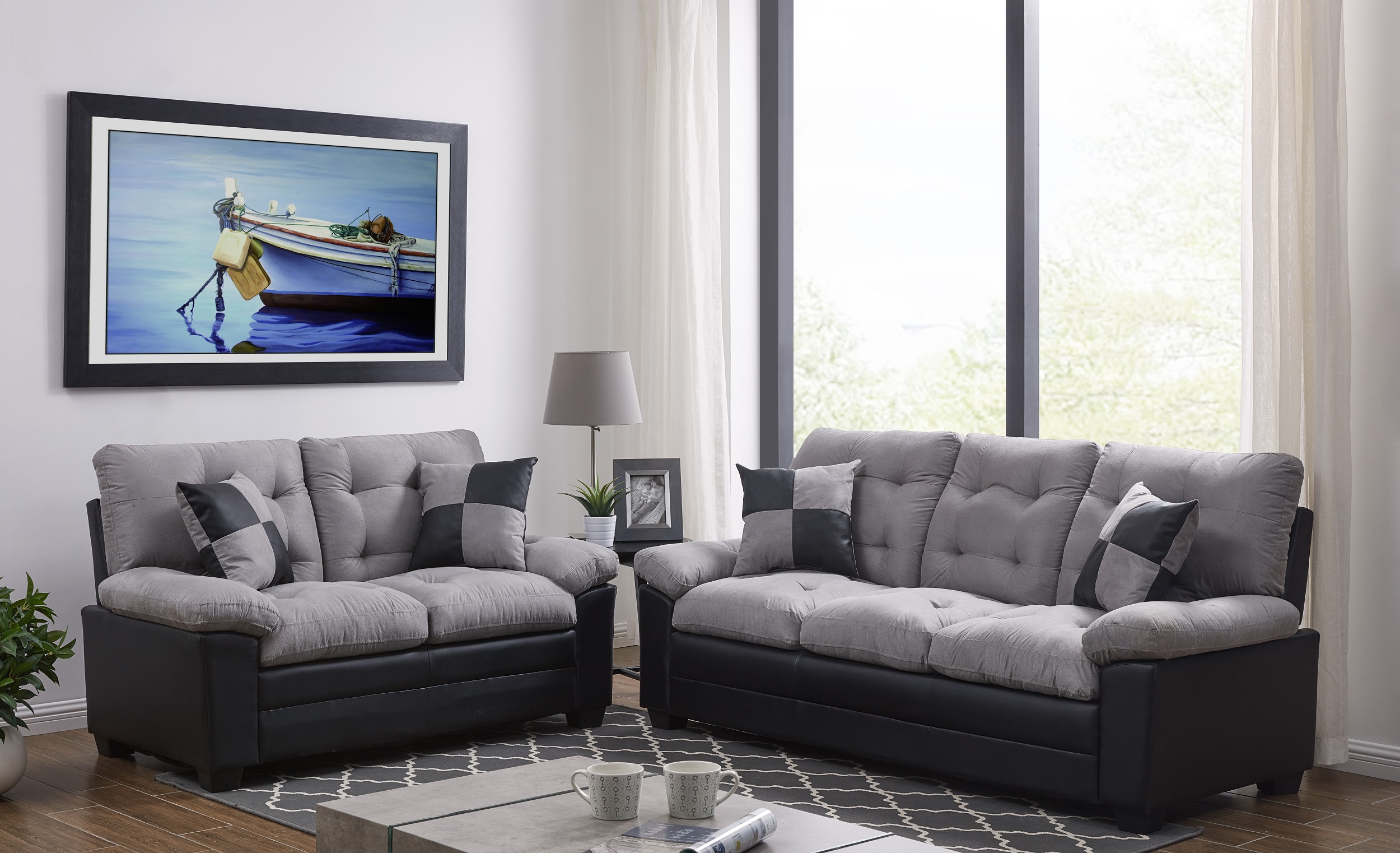 Living Room Plush Cushion Tufted Sofa Loveseat Grey Black Microfiber 2p Sofa Set