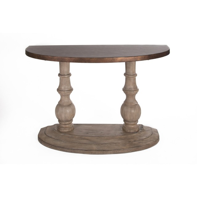 Alamosa Weathered Light Grey And Copper Half Moon Sofa Table Copper