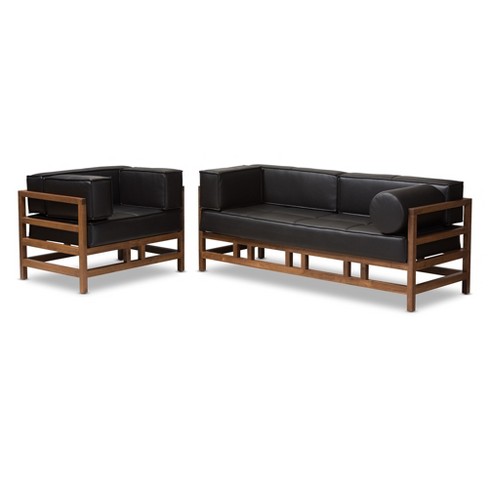 Shaw Midcentury Modern Pine Faux Leather Walnut Wood 2pc Living Room Sofa Set Black Baxton Studio
