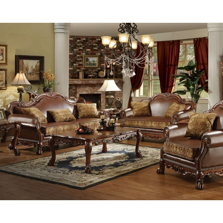 Aubrey Old World Brown Faux Leather Chenille Sofa Couch Loveseat Set Living Room