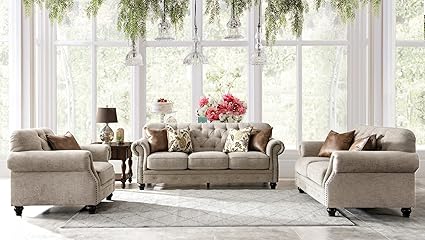 Acanva Chesterfield Chenille Living Room Set Sofa 3 Piece Almond