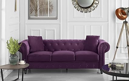 Divano Roma Furniture Classic Velvet Scroll Arm Tufted Button Chesterfield Sofa Purple