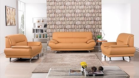American Eagle Furniture 3 Piece Harrison Collection Complete Genuine Leather Living Room Sofa Set Yellow