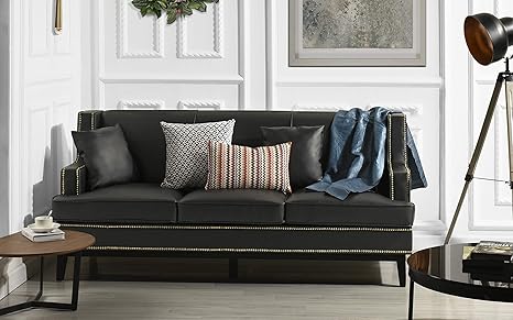 Leather Sofa 3 Seater Living Room Couch With Nailhead Trim Black
